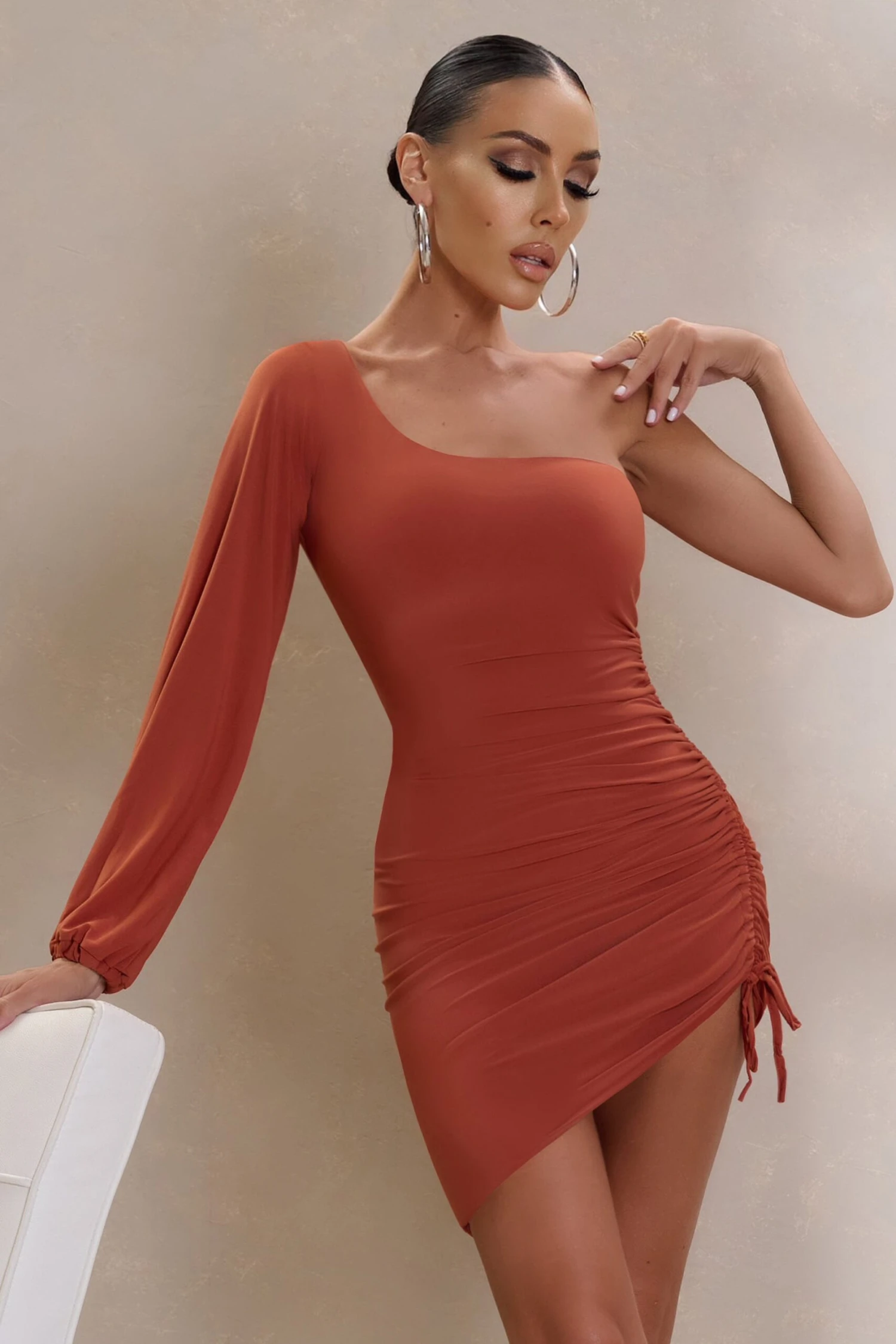 Rise Above | Rust One Shoulder Ruched Midi Dress