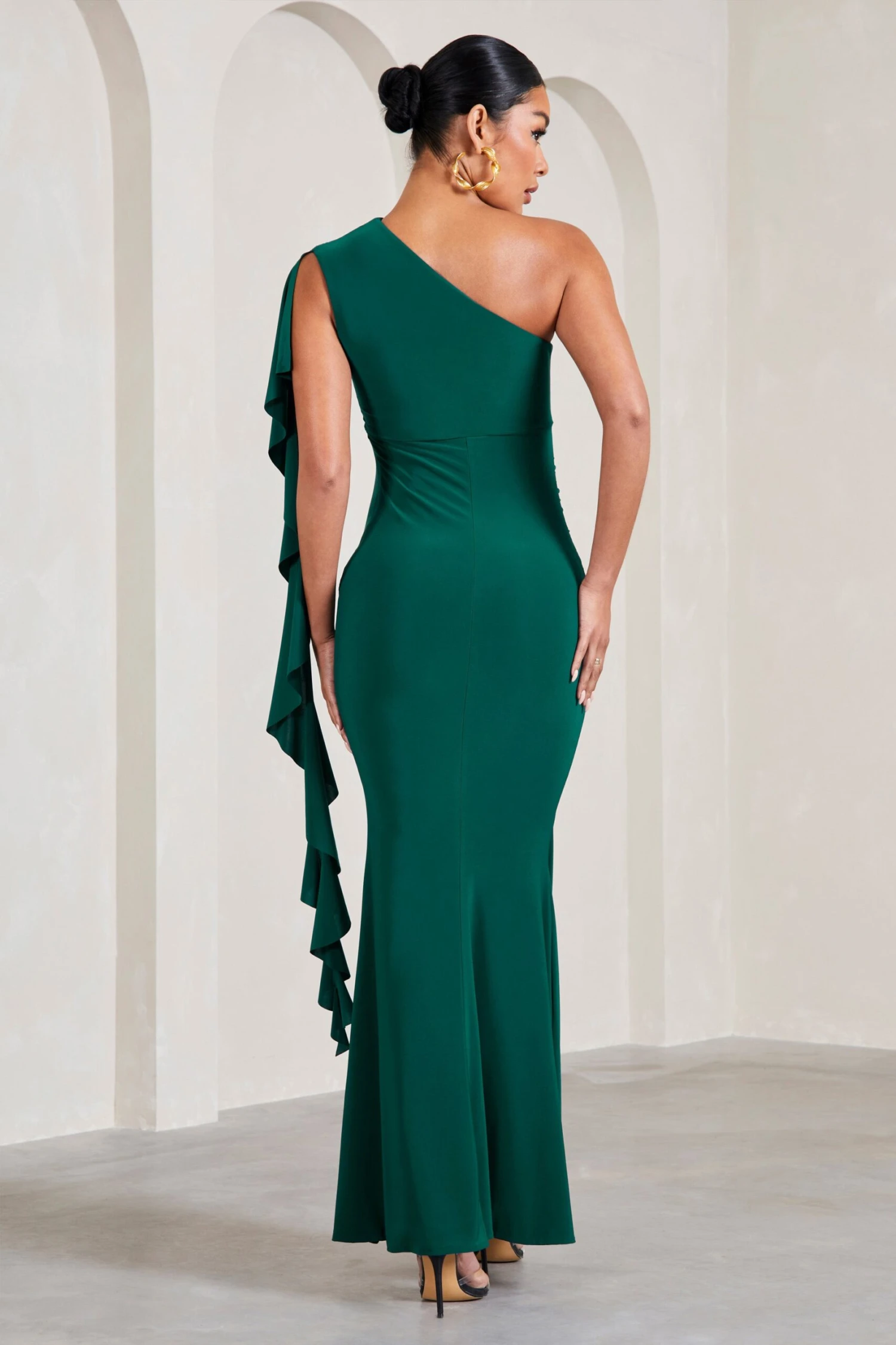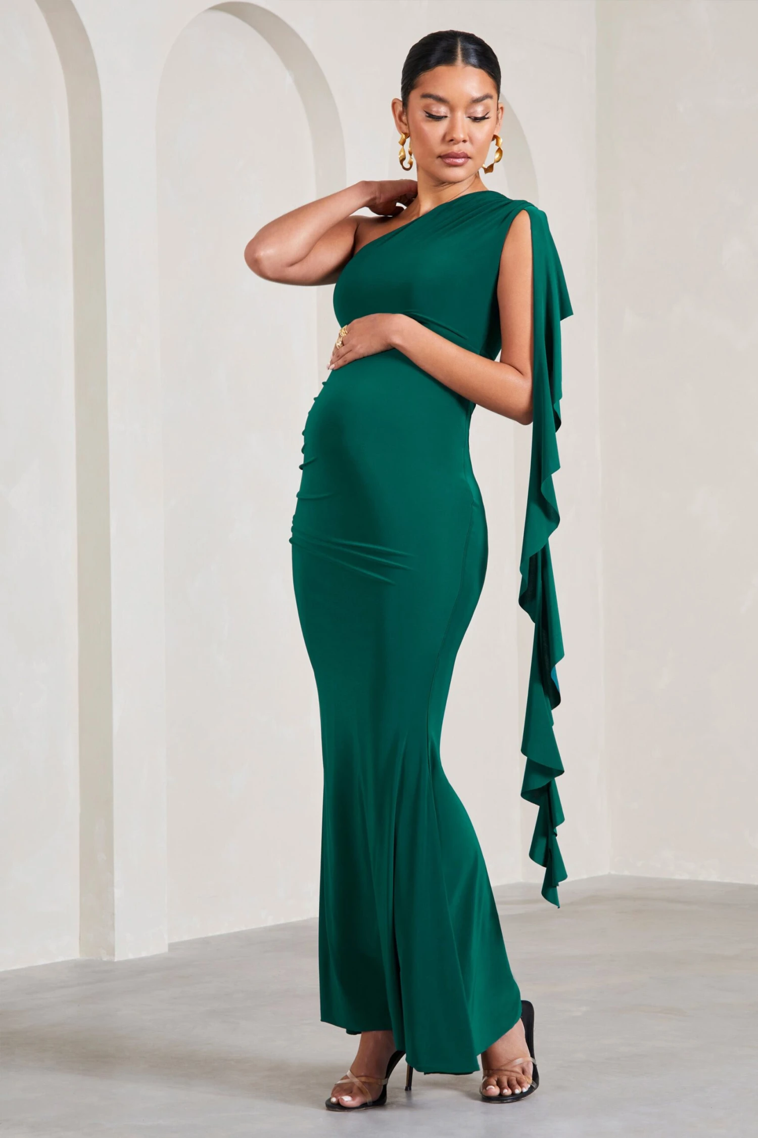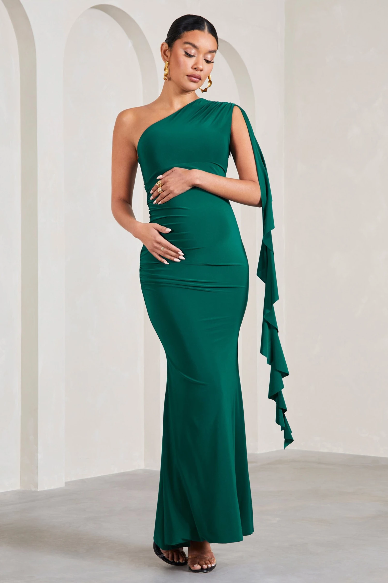 Add some flair to your maternity wardrobe this party season with our bottle green maxi Rosalie. Crafted in our signature stretch jersey, this dress is defined by a delicate ruffle detail that drapes effortlessly down your side. Finishing with an elegant fishtail skirt, try styling Rosalie with gold earrings and a sleek bun for the perfect wedding guest ensemble.Â