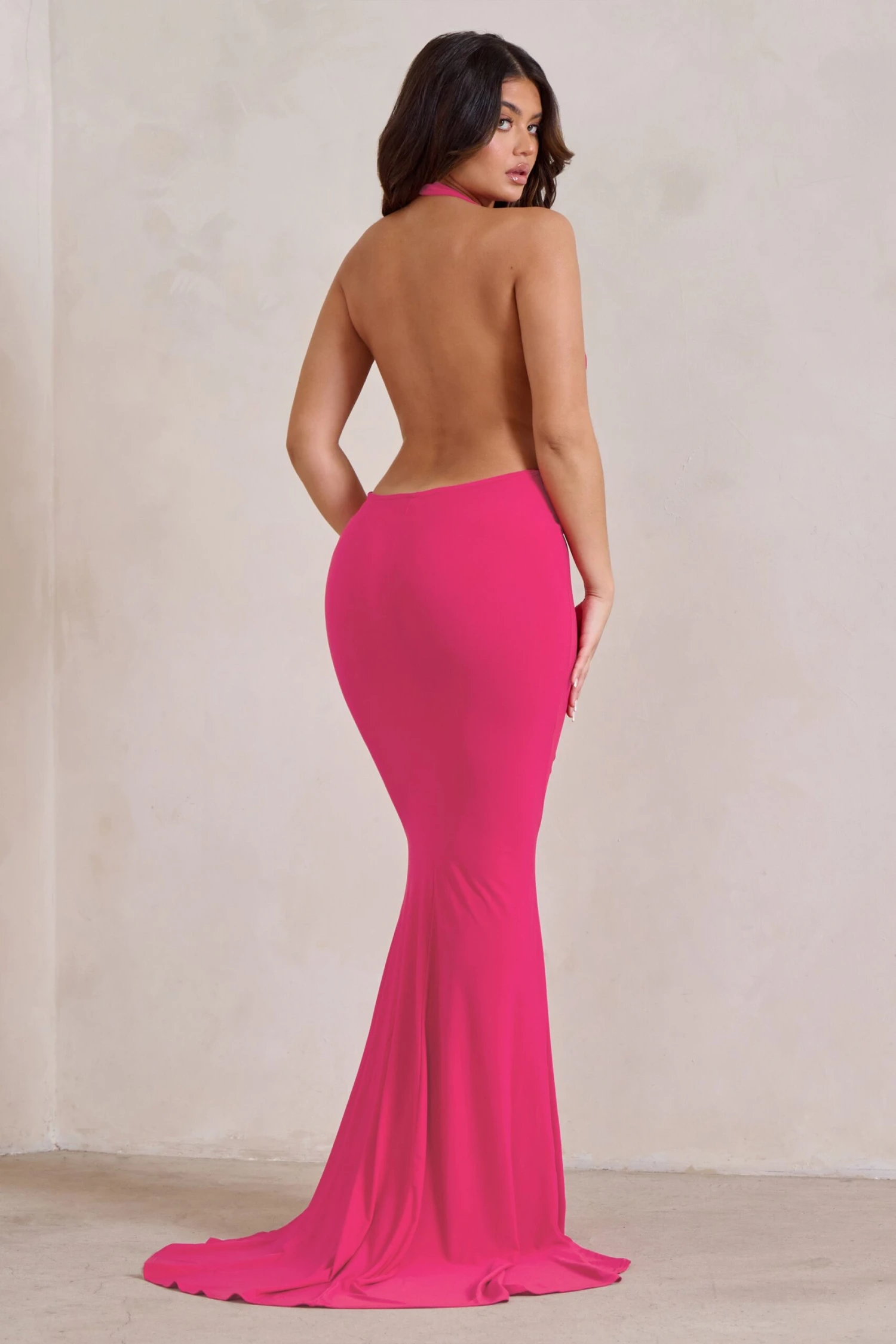 For effortless elegance this party season, there’s no maxi dress quite like Saffina. Crafted from our premium pink jersey with a hint of stretch to contour your curves, this floor-sweeping maxi dress boasts a fishtail silhouette with a plunging cowl neckline and a dramatic open back. Complement the fuchsia hue of Saffina with gold accessories at your next formal event.