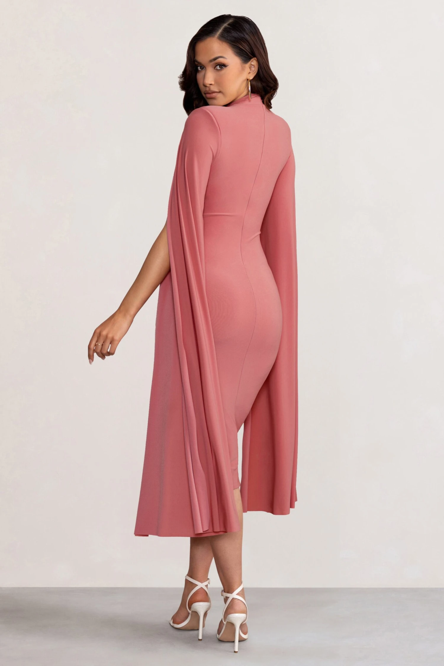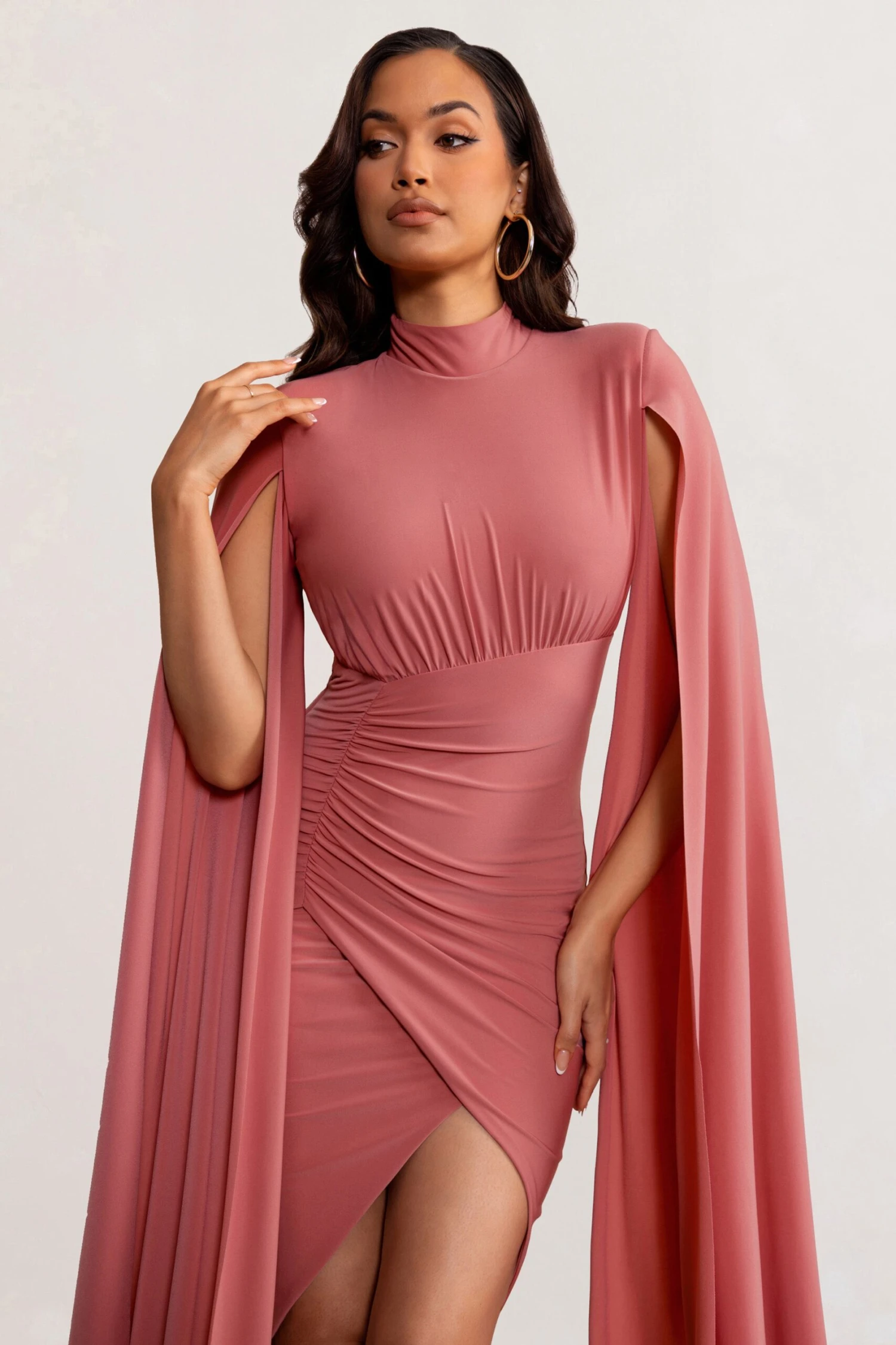 Sara | Blush High Neck Ruched Midi Dress With Cape Sleeves
