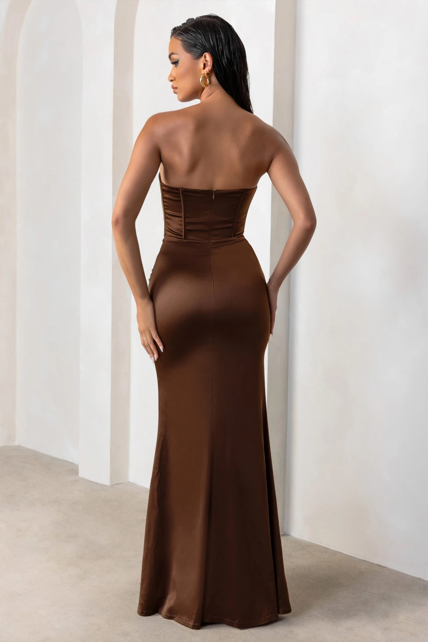 Sensual Notes | Chocolate Brown Satin Strapless Corset Thigh Split Maxi Dress
