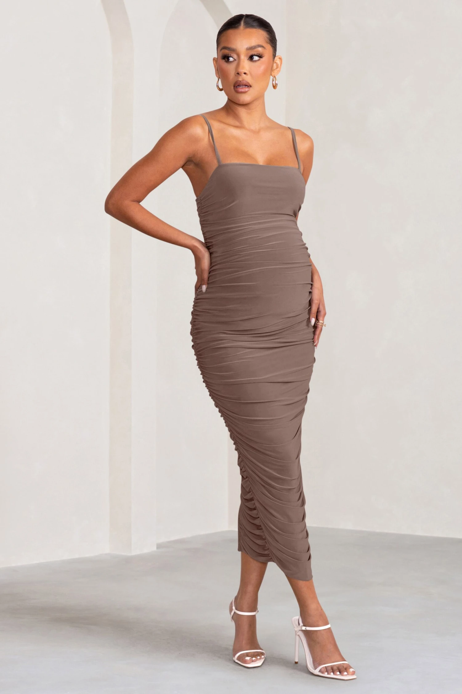 Sentimental is the maternity dress to showcase your new curves at any social engagement. Boasting a classic silhouette cut from a comfortable double-lined jersey, this mocha brown bodycon dress features a straight neckline, adjustable cami straps and a calf-length skirt that’s split from behind.