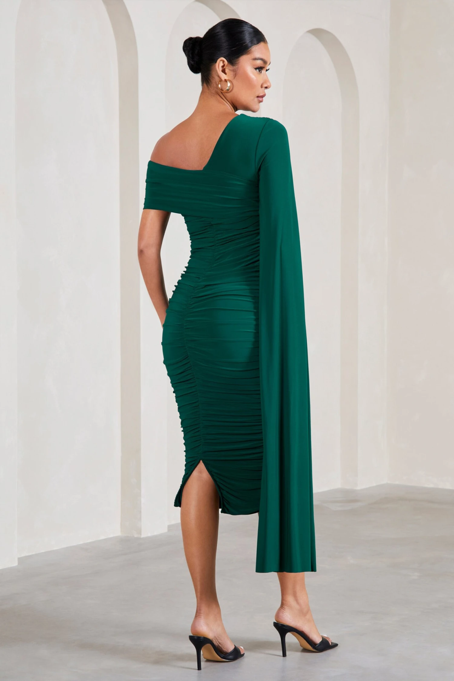 Meet Serenity, a maternity dress to see you through any formal occasion. Crafted in a rich bottle green shade of our premium stretch jersey, this midi is wrapped in full body ruching and boasts an asymmetric neckline that sits elegantly off the shoulder. An extravagant cape sleeve defines Serenity, making it the perfect pick for any upcoming race day or wedding event.Â