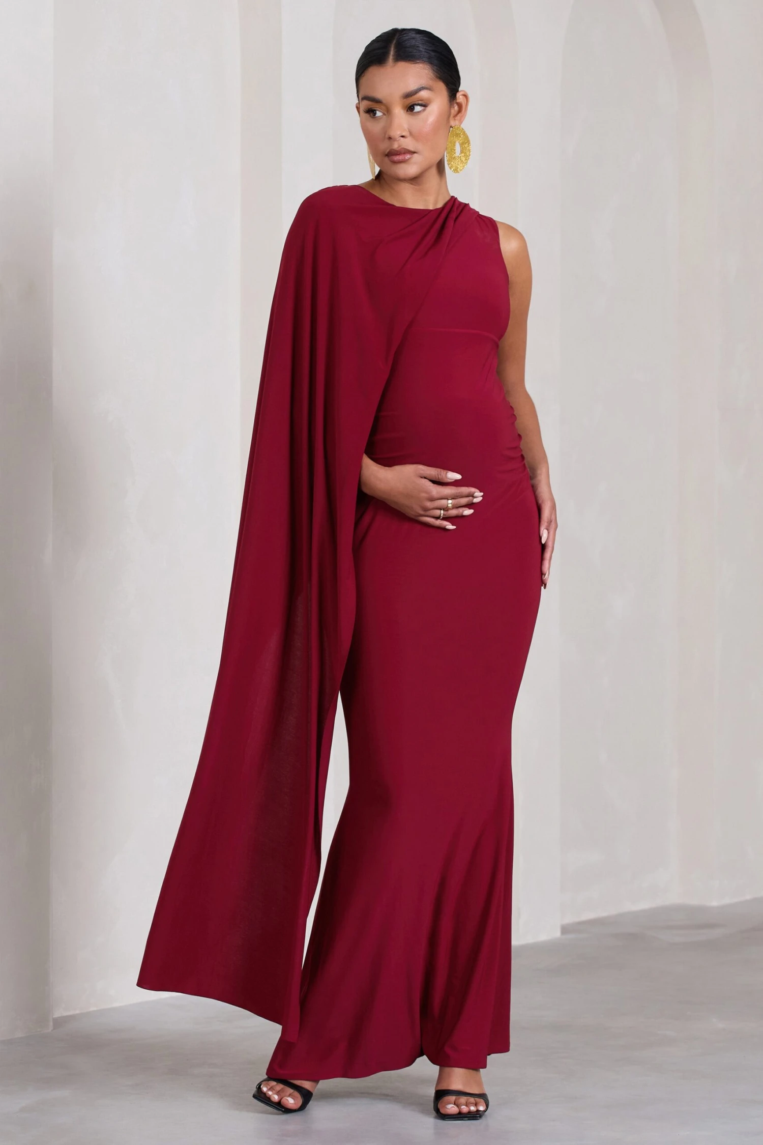 Cut from a smooth premium stretch jersey that clings to each curve, Unveil is a form-flattering option for any black tie event. Arriving in a rich berry hue, this maternity maxi dress is characterised by its unforgettable cape feature that sits delicately across one shoulder. Keep Unveil at the forefront of your next event by styling it with a sleek bun and small gold hoops.Â