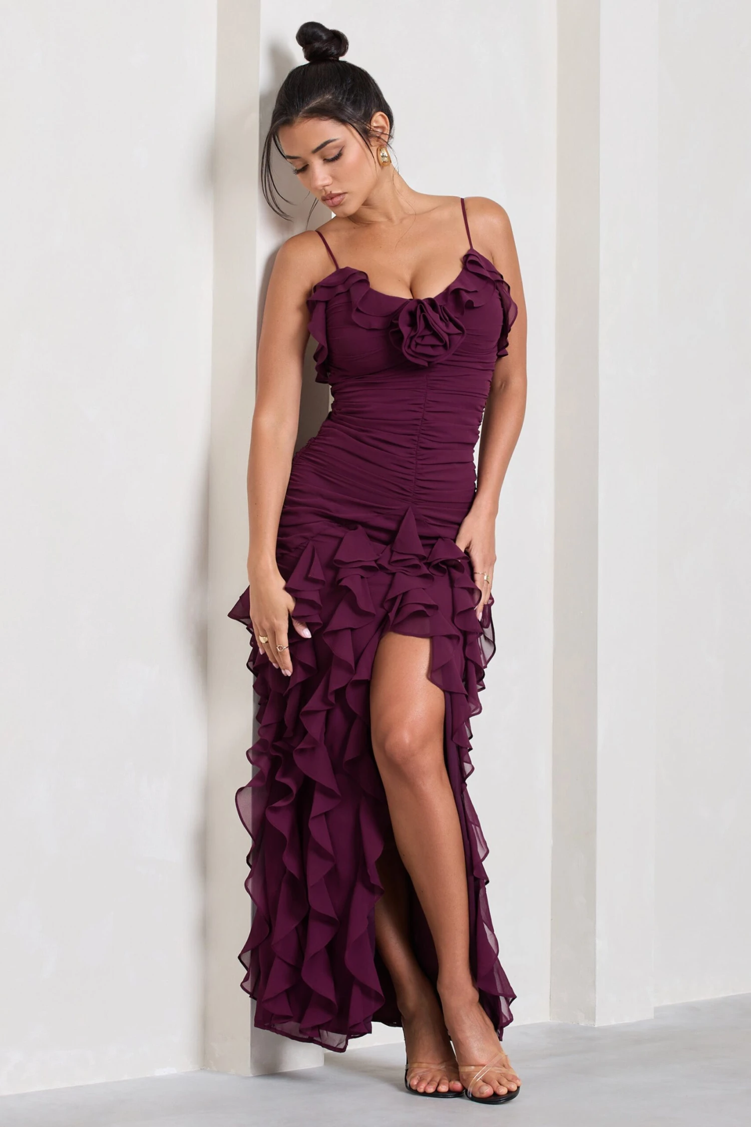 Be the first to review “Walks Alone | Burgundy Ruched Strappy Split Maxi Dress With Ruffles” Cancel reply
