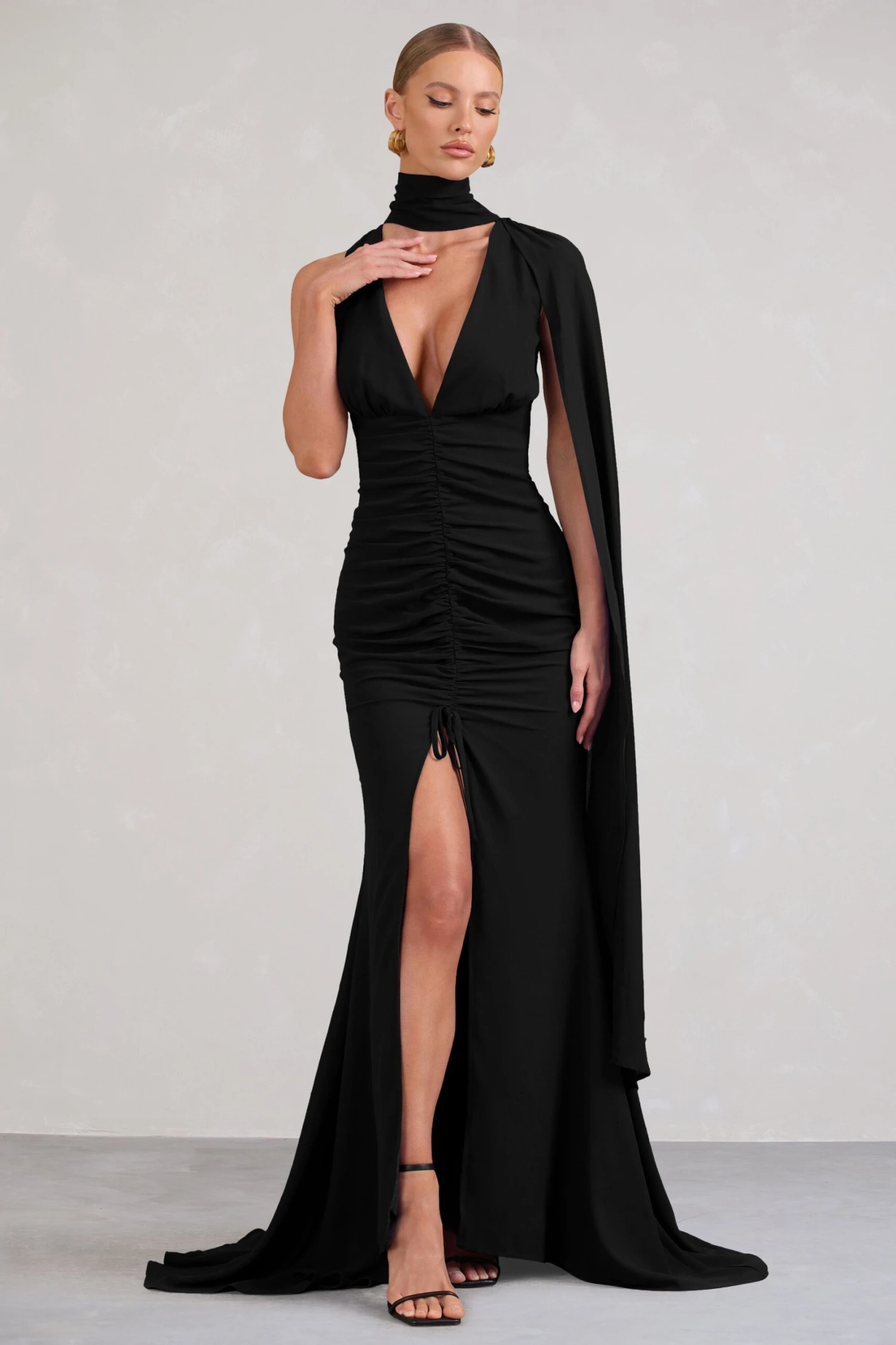 Alina | Bottle Green Ruched High-Neck Asymmetric Split Maxi Dress