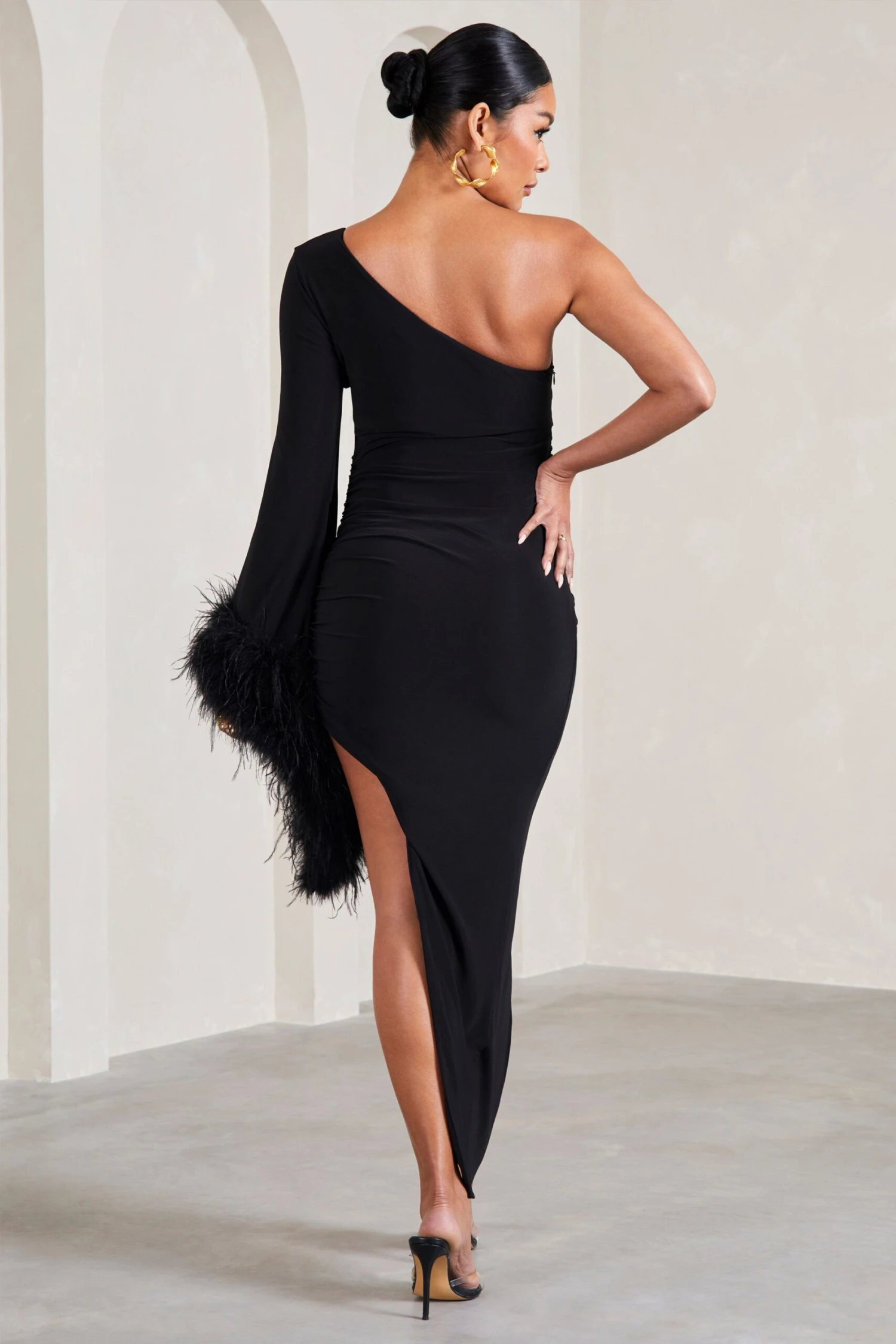 Update your wardrobe this party season with our opulent maternity maxi With A Flourish. This sculpting black dress is characterised by a singular wide sleeve that drapes delicately into a soft feather trim before finishing with an asymmetric hemline. With multiple elevated details that bring the drama, keep With A Flourish at the forefront by styling it with a sleek bun.Â