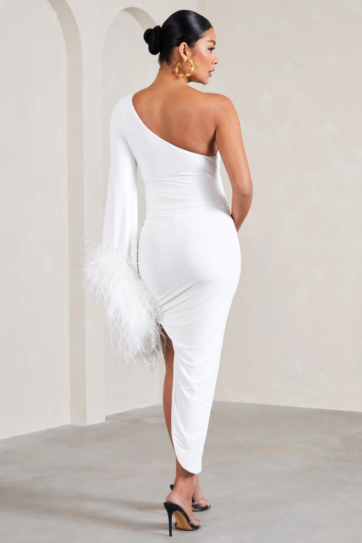 Update your wardrobe this party season with our opulent maternity maxi With A Flourish. This crisp white dress is characterised by a singular wide sleeve that drapes delicately into a soft feather trim before finishing with an asymmetric hemline. With multiple elevated details that bring the drama, keep With A Flourish at the forefront by styling it with a sleek bun.