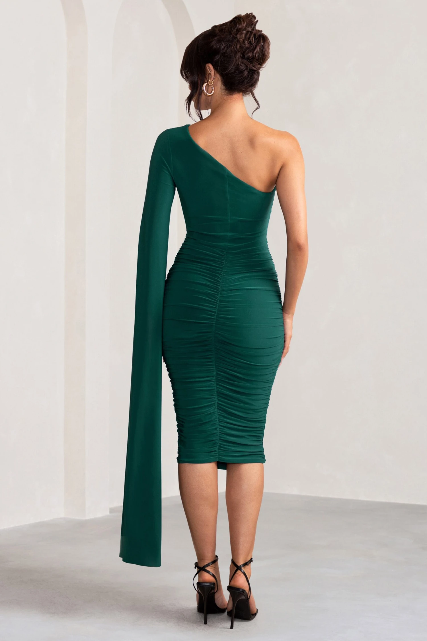 Our Yara in green is a new season must-have. Featuring one shoulder with a cape detailing, Yara promises to deliver dramatic impact. The midi dress design complete with ruching sculpts your silhouette so that you can step out in confidence. For the ultimate evening event dress, Yara is the one. Steal the show with Yara.