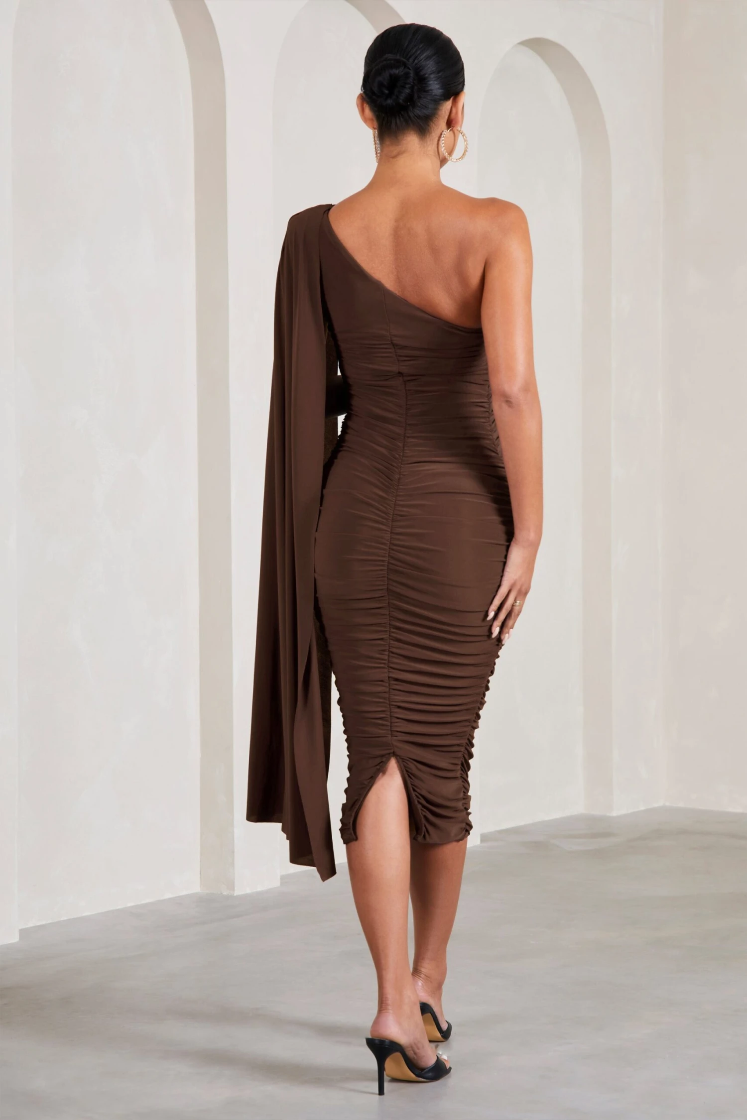 Make a glamorous statement in Yara, our gorgeous midi dress in a rich chocolate brown hue. Crafted in our signature double-lined jersey, this dress will contour your silhouette and accentuate your curves. Featuring an asymmetric neckline with a one-shoulder drape and full-body ruching, this dress is guaranteed to turn heads at your next event.